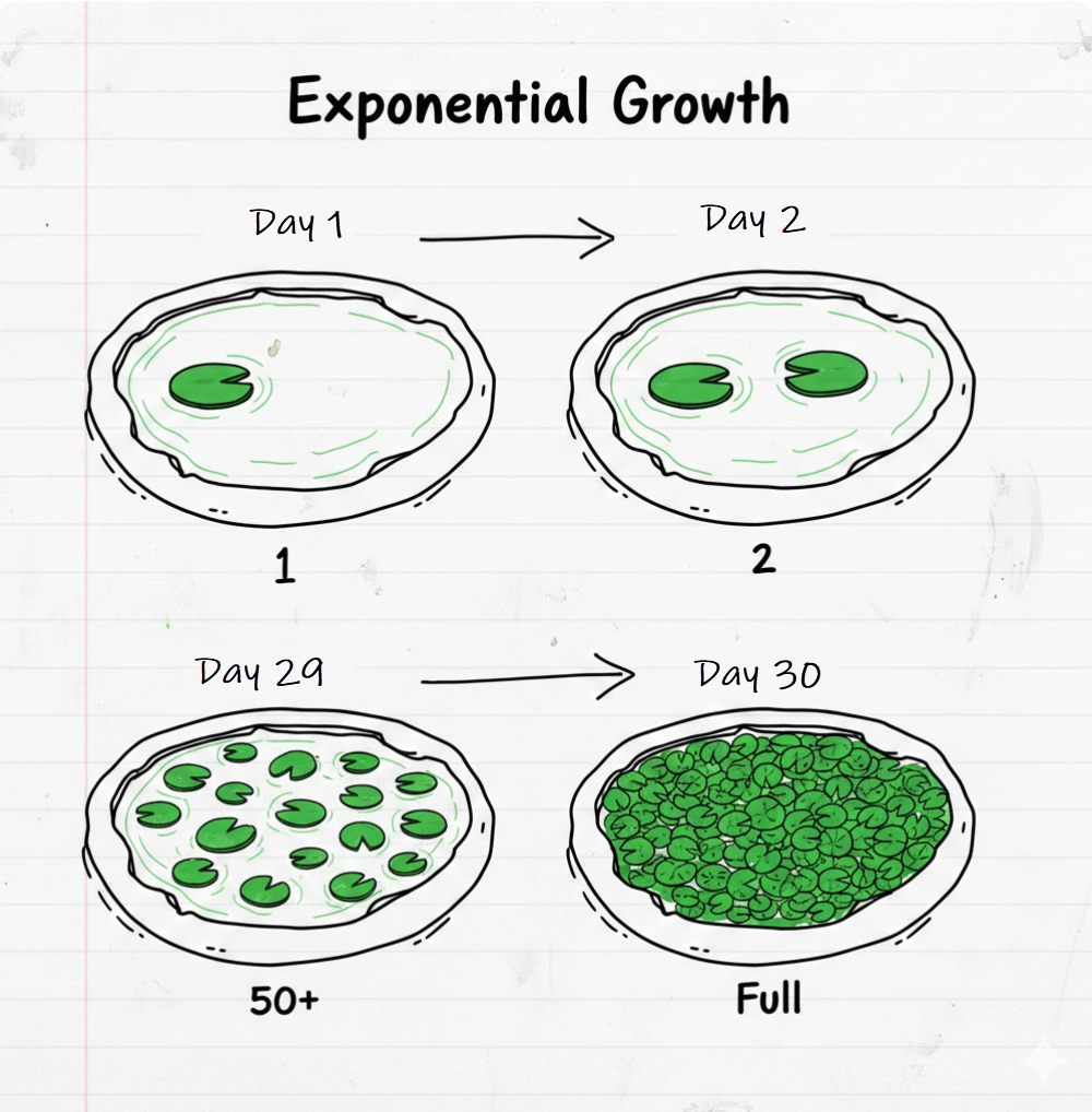 For example, think about how compounding interest works, or better yet, lily pads in a pond. It barely moves for years, then suddenly it snowballs. The math is the same. Small, consistent gains look small or insignificant, until they don’t.